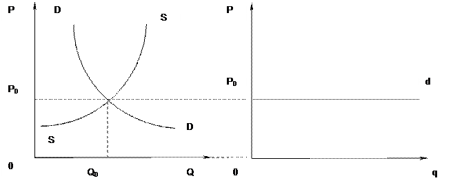 Рис. 13. Зависимость спроса на продукцию отдельной фирмы от равновесия на отраслевом рынке: а – отраслевой рынок; б- рынок отдельной фирмы.