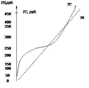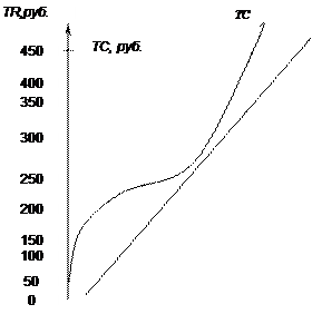 На рис. 14 точки A и B указывают объемы производства, где кривая валового дохода TR и кривая общих валовых издержек TC совпадают. Это точки безубыточности работы, внутри которых находятся интервал прибыльности и оптимальной объем производства в 5 единиц. На рис. 15 кривая валового дохода TR везде расположена ниже кривой общих валовых издержек TC. Минимальный убыток образуется при объеме производства в 4 единицы.