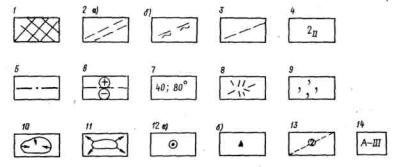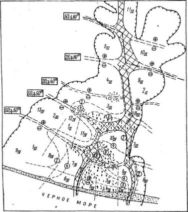 1 - зона дробления поперечного разрыва второго порядка; 2- линии продольных разрывов третьего порядка: а) достоверные; б) предполагаемые; 3 - линии продольных и поперечных разрывов четвертого порядка; 4 - структурно-тектонические блоки: арабская цифра- номер блока, римская цифра - порядок блока; 5 - граница раздела опускающейся и поднимающейся территорий; 6- знак относительного перемещения смежных тектонических блоков; 7 - цифры (слева направо): максимальная амплитуда относительного перемещения смежных тектонических блоков, угол наклона видимой поверхности сместителя; 8 - участки повышенной тектонической раздробленности коренных пород таврической серии; 9 - участки зон дробления разрыва с повышенным содержанием белых порошкообразных солей (гипс, тенардит); 10 - участки поглощения зонами тектонических разрывов (в породах таврической серии) подземных вод из оползневых накоплений; 11- участки подпитывания подземных вод оползневых накоплений водами повышенной минерализации, поступающими из зон дробления и трещиноватости тектонических разрывов; 12 - а) буровые скважины, б) точки вертикального электрозондирования, зафиксировавшие зоны дробления тектонических разрывов; 13 - изолинии равных величин минерализации подземных вод, вскрытых в коренных породах и смещенных блоках таврической серии; в кружочке величина минерализации, г/л; 14 - индекс оползневой системы: буква-группа системы, цифра - тип системы (в соответствии с типизацией оползневых систем ЮБК по тектоническим факторам оползнеобразования).