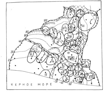 1- контур оползневого блока и его номер; 2- стенка срыва (ниша отрыва) блока; 3 - тип зоны выветривания, развитой в кровле блока (показывается разным цветом): а) первая зона выветривания - глина с полностью разрушенной текстурой материнских пород, б) вторая зона выветривания - мелкочешуйчатые аргиллиты с прослоями глин (с реликтами текстуры материнских пород), в) третья зона выветривания - мелкочешуйчатые аргиллиты, г) четвертая зона выветривания - мелкочешуйчатые аргиллиты с прослоями тонко-плитчатых; 4 - прослои в блоке: а) песчаника, б) алевролита; 5 - обводненные блоки; 6 - направление смещения блока: верхняя стрелка - первоначального, нижняя - современного; 7 - изогипсы кровли коренных пород; 8 - контур оползня; 9 - зоны тектонических нарушений; 10- буровые скважины; 11- индекс зоны оползневого смещения.