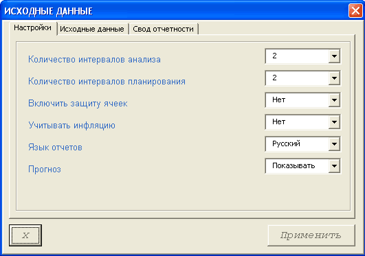В случае сведения отчетности кнопка «Применить» вызовет изменения только на первых 2-х закладках «Настройки» и «Исходные данные». Для работы со сведением отчетности необходимо пользоваться кнопками находящимися непосредственно на закладке.