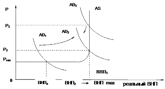 Равновесие на II промежуточном участье кривой AS обеспечивает ВНП2, равный или близкий максимальному (ВНПmax). При этом уровень цен Р2 лишь незначительно превышает Pmin.