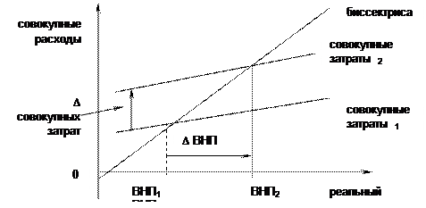 Задача стабилизационной политики государства – воздействовать на величину совокупных расходов и тем самым на величину ВНП. Увеличение совокупных расходов (рис. 26) увеличивает равновесный ВНП с ВНП1 до ВНП2. Уменьшение совокупных затрат уменьшает равновесный ВНП.