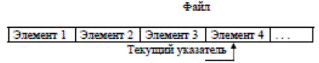 В любой момент времени программе доступен только один элемент файла, на который ссылается текущий указатель (указатель обработки). Часто позицию размещения доступного элемента называют текущей позицией .