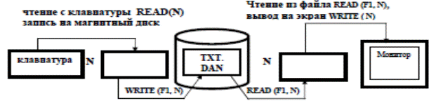 WRITE (F1, N) {READ (F1, N):} – Запись(чтение) текста в файл на магнитный диск.