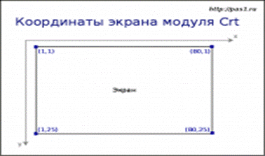 Стандартный экран в Паскале чаще формируется из 25 сток и 80 столбцов. Строки нумеруются сверху вниз, а столбцы слева на право. Нумерация начинается с единицы (что может показаться непривычным).