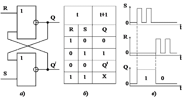а – схема; б – таблица истинности; в – временная диаграмма