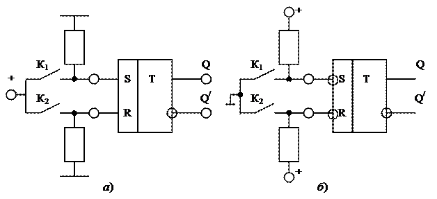 Условные изображения RS- триггера с прямым и инверсным входами приведены на рисунке 38. кратковременным замыканием ключа К1 или К2 устанавливаются устойчивые состояния триггеров Q = 1 или Q = 0.