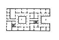 греко-римский жилой дом – жилые помещения располагаются вокруг атриума и перистиля симметрично по обе стороны от главной оси. 1 – атриум; 2 – перистиль.