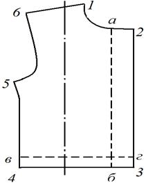 | Перед | | 1–2 – срез горловины; 2–3 – срез борта; 3–4 – срез низа; 4–5 – боковой срез; 5–6 – срез проймы; 1–6 – плечевой срез; а–б – линия полузаноса; в–г – линия подгиба низа | |