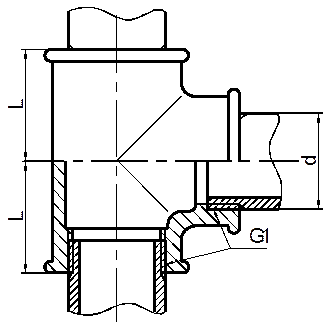 - для полностью завинченной трубы за торец соединительной части (фитинга) выходит только сбег резьбы (на чертеже он изображается тонкой наклонной линией);