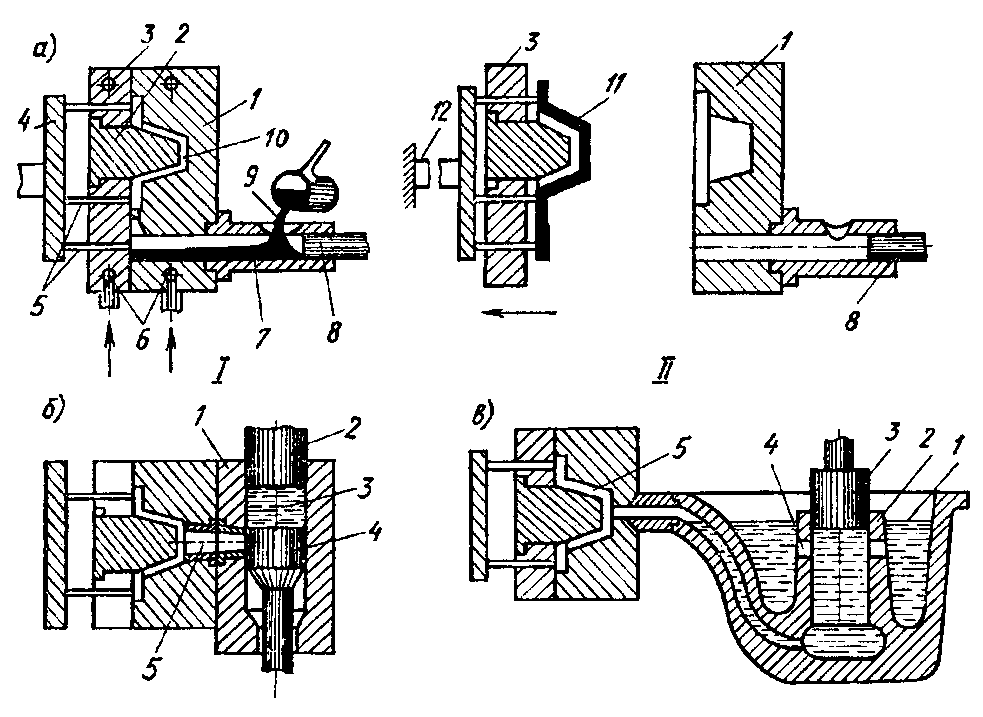 Перед заливкой пресс-форму подогревают и наносят смазку на ее рабочие поверхности, камеры прессования 7 и пресс-поршня 8 (рисунок 1.22, а). В камеру прессования (позиция I) заливают мерную порцию сплава 9. Пресс-поршень 8 перекрывает заливочное отверстие, создает давление в камере прессования и сплав с большой скоростью заполняет полость формы 10. После затвердевания сплава пресс-форма раскрывается с отходом подвижной матрицы вместе с отливкой, плунжер возвращается в исходное положение. Плита толкателей перемещается вместе с пресс-формой до упора 12 (позиция II). При дальнейшем движении пресс-формы толкатели снимают отливку 11 со стержня 2 и она поступает в контейнер. Пресс-форму обдувают сжатым воздухом, смазывают, закрывают и процесс литья повторяется.