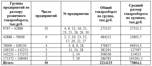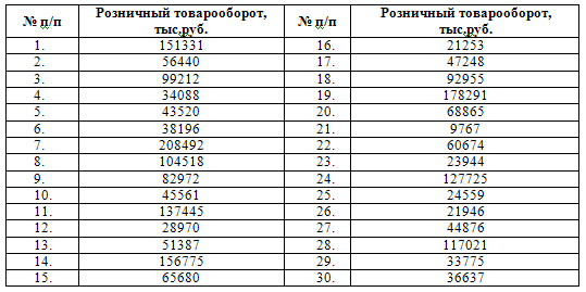Пример. Распределение предприятий по региона по величине розничного товарооборота в текущем году.