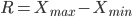 Размах вариации — это разность между максимальным и минимальным значениями признака