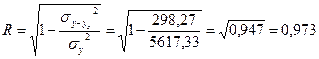Совокупный коэффициент множественной корреляции или индекс множественной корреляции определяет тесноту совместного влияния факторов на результат: