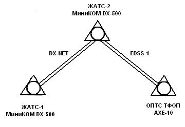 При организации оперативно-технологической связи на больших железнодорожных станциях при установке коммутаторов МиниКОМ DX -500.ЖТ в нескольких местах станции (с распределенным включением абонентов) необходимо соединить эти коммутаторы потоками Е1 по схеме каждый с каждым. Использование в этих потоках специализированного протокола DX-NET позволяет получить единый пространственно-распределенный коммутатор, причем включение, как входящего, так и исходящего цифровых потоков групповых диспетчерских связей может выполняться в любой коммутатор данной станции. Для организации внутристанционных потоков Е1 может использоваться медный симметричный кабель (при расстояниях до 1 км), системы передачи по ВОЛС либо модемы, работающие по протоколам xDSL.