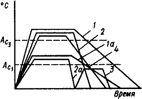 Рис.12.1. Графики различных видов термообработки: отжига (1, 1а), закалки (2, 2а), отпуска (3), нормализации (4)