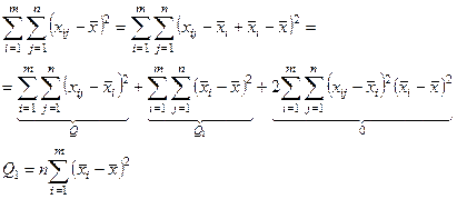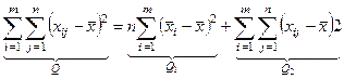 Слагаемое Q1 является суммой квадратов разностей между средними отдельных совокупностей и общей средней всех совокупностей. Эта сумма называется суммой квадратов отклонений между группами. Она характеризует систематическое отклонение между совокупностями наблюдений.
