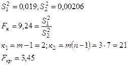 Выбираем уровень значимости α, или доверительной вероятности 1– α = Р и по таблице F-распределения с числом степеней свободы: к1 = m–1; к2 = m(n–1) находим критическое значение