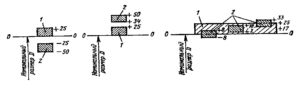 Для упрощения точностных расчетов размеров и сопряжений поверхностей деталей используют схемы полей допусков (рисунок 4.1, б).При этомось сопрягаемых поверхностей располагают под схемой и условно не показывают. Поле допуска на схеме ограничено между верхним и нижним отклонением, оно определяется значением допуска и его положением относительно номинального размера, обозначаемого на схеме как нулевая линия – линия отсчета отклонений (положительных – вверх, отрицательных – вниз).