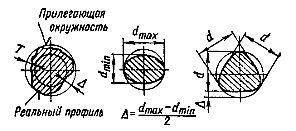 Отклонение от круглости – наибольшее расстояние Δ от точек реального профиля до прилегающей окружности (рисунок 4.7, а). Допуск круглости Т – наибольшее допускаемое значение отклонений от круглости. Частными видами отклонений от круглости являются овальность и огранка (рисунок 4.7, б, в).
