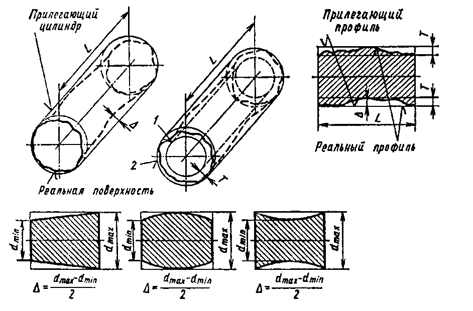 Отклонение профиля продольного сечения – наибольшее расстояние Δ от точек образующих реальной поверхности в плоскости, проходящей через ее ось, до соответствующей стороны прилегающего профиля в пределах нормируемого участка - (рисунок 4.8, в). Частными видами отклонений от профиля продольного сечения являются конусообразность, бочкообразность и седлообразность (рисунок 4.8, г, д, е).