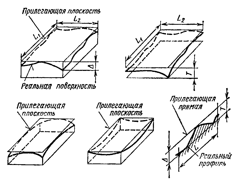 Отклонение от плоскостности определяют как наибольшее расстояние Δ от точек реальной поверхности до прилегающей плоскости в пределах нормируемого участка (рисунок 4.9, а). Допуск плоскостности – наибольшее допускаемое значение отклонений от плоскостности (рисунок 4.9, б). Частными видами отклонений от плоскостности являются выпуклость и вогнутость (рисунок 4.9, в, г).