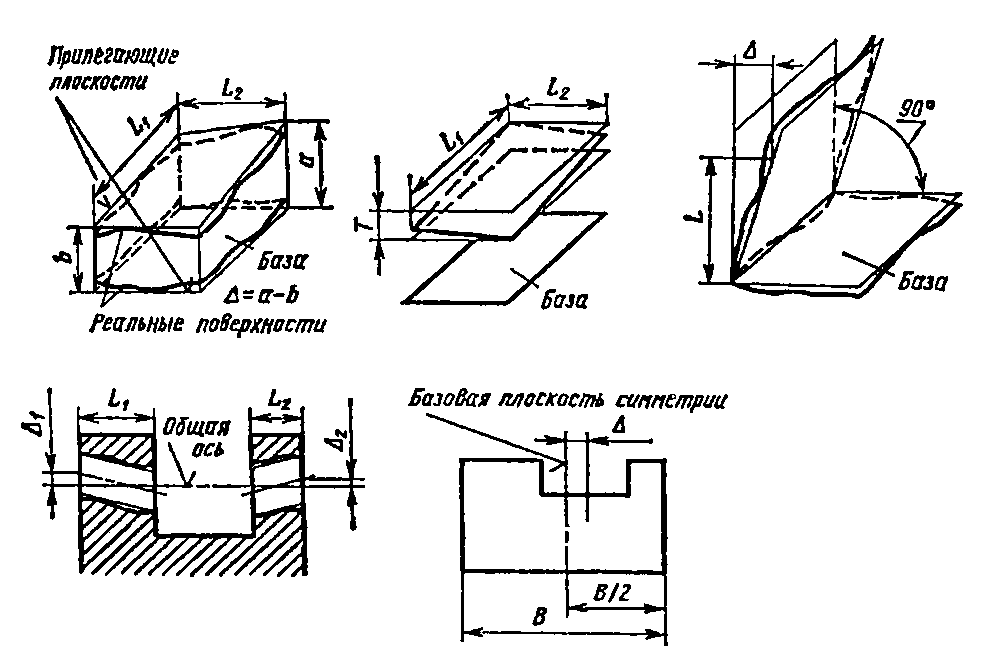 - отклонение от симметричности относительно базовой плоскости – наибольшее расстояние Δ между плоскостью симметрии рассматриваемой поверхности и базовой плоскостью симметрии (рисунок 4.10, д).