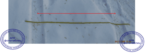 Рис. 37. Фотоснимок следа протектора ТС. Стрелкой красителем красного цвета указана ширина колеи