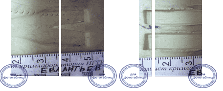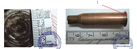 На рис. 45, 46 красителем красного цвета и одноименными цифрами отмечены: 1 – след губы магазина; 2 – след зацепа выбрасывателя 3 – след отражателя; 4 – след бойка ударника; 5 – след нижней части передней плоскости патронного упора затвора