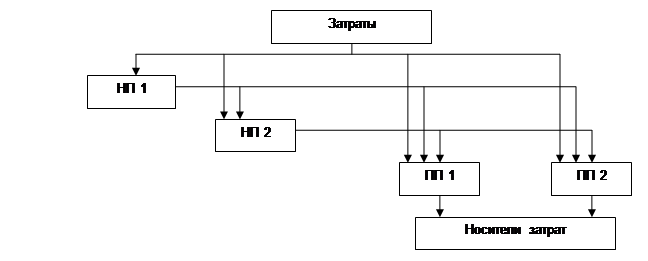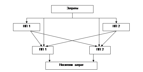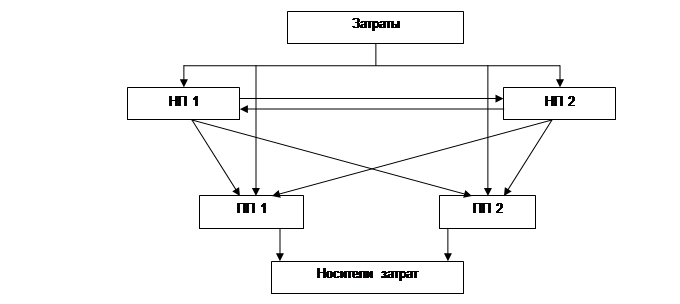 Как видно из рисунка, каждый непроизводственный центр оказывает услуги всем остальным цехам, как основным, так и вспомогательным. Процесс распределения и расчета затрат производственных подразделений усложняется, так как непрямые затраты каждого основного цеха будут состоять из: