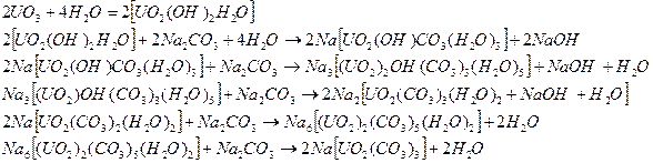 Суммарная реакция растворения трехокиси урана в карбонатных растворах описана выше. Однако, процесс растворения UO3 намного сложнее. Считают, что наиболее полно растворение UO3 иллюстрирует следующие реакции /5/: