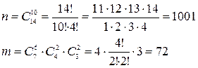 , где n – общее число исходов (в данном случае, количество способов, которыми можно выбрать 10 карандашей из 14-ти), m – число благоприятных исходов (т.е. количество способов, которыми можно выбрать 6 синих карандашей из 7-ми, 2 красных из 4-х, и 2 зеленых из 3-х).