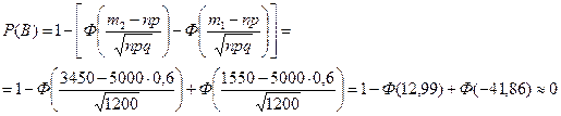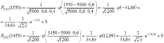 Таким образом, выполнение условия а) возможно только в двух случаях: когда за кандидата А проголосовало 1550 избирателей или 3450 избирателей. Используя локальную теорему Муавра-Лапласа, найдем вероятности этих двух событий: