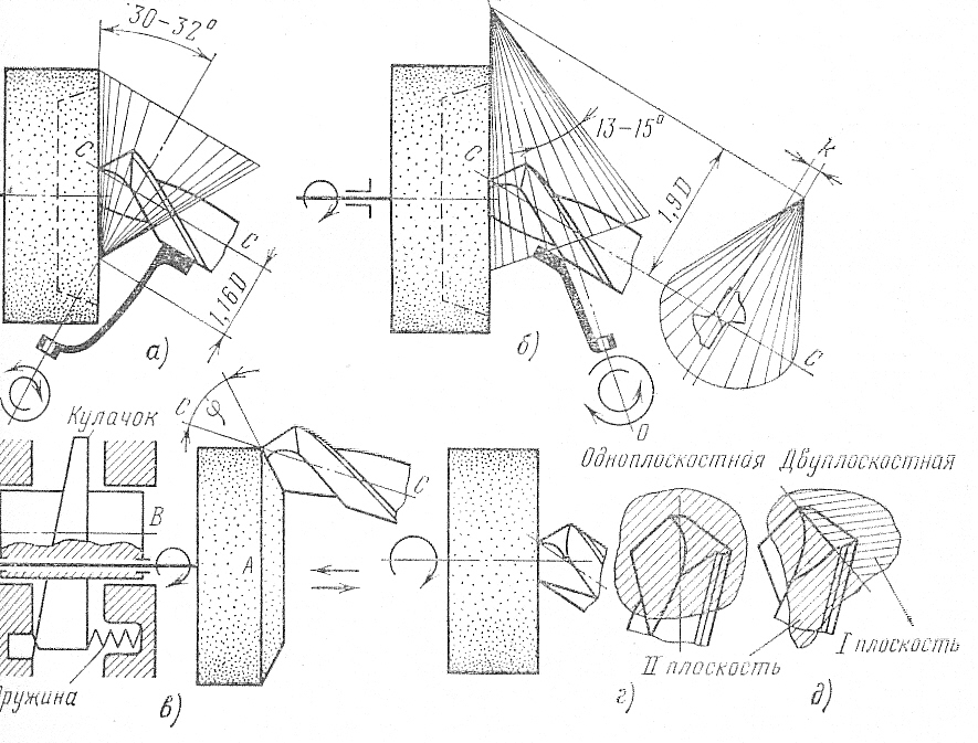 • Одноплоскостная (г) – наиболее простая в технологическом плане, но требует больших задних углов, дает прямолинейную поперечную кромку, не обеспечивающую правильного центрирования сверла при работе без кондуктора. Значения заднего угла и угла наклона поперечной кромки зависят от угла при вершине и заднего угла на периферии. Используют для мелких сверл диаметром до 3 мм.