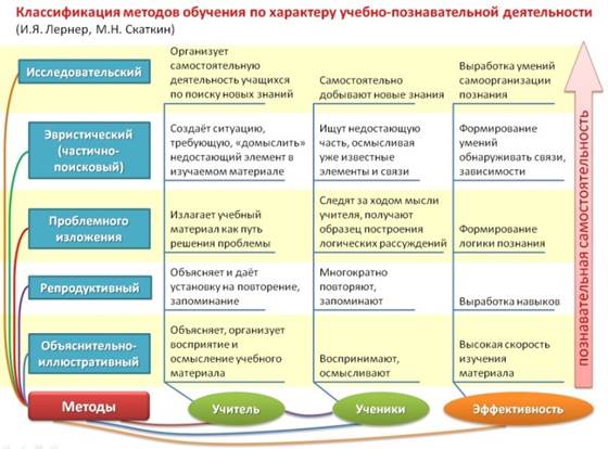 - по мышлению: репродуктивные (воспроизводящие, основанные на запоминании учебного материала) и проблемно-поисковые (связанные с добыванием знаний самим учеником);