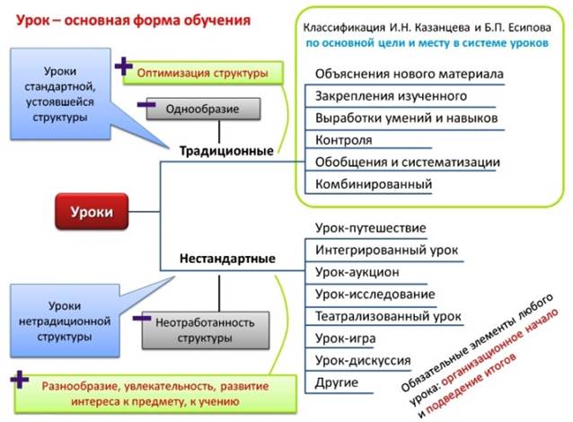 Уроки можно классифицировать по целям, методам, средствам обучения и др. Традиционной считается классификация И.Н. Казанцева и Б.П. Есипова по целям и месту в общей системе уроков. Согласно этой классификации, выделяется шесть типов урока: