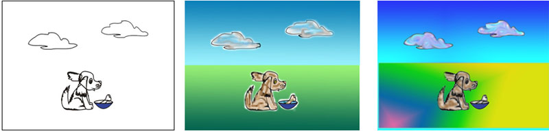 Контуры всех элементов рисунка (собаки, облаков, миски с косточкой) созданы кистью. Закраска земли и неба выполнена градиентом, а миски с косточкой – инструментом Paint Bucket (Заливка). Внутри облаков сначала сделано несколько штрихов синего, голубого и серого цветов, а затем вращательными движениями по этим штрихам инструментом Smudge (Палец) получены клубы облаков.