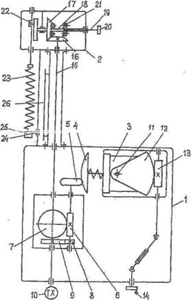 Вращение червячного колеса 7 передается через вертикальный вал 15 и коническую шестерню 16 коническому колесу 17, насаженному на вал 18 свободно и имеющему со стороны зубьев кулачки. Бал 18 выполнен полым и имеет продольный паз. Е полости вала 18 находится валик 19 с ручкой 20. На вал 18 также посажена кулачковая полумуфта 21, в ступицу которой запрессован штифт, проходящий через продольный паз вала 18 и отверстие валика 19. Когда кулачки полумуфты 21 находятся е зацеплении с кулачками конического колеса 17, вращение передается от последнего на вал 18. Далее вращение вала 18 преобразуется при помочи кулисного механизма 22 в колебательное движение верхнего конца пружины 23, к которой подвешивается траверса 24 с грузом 25.