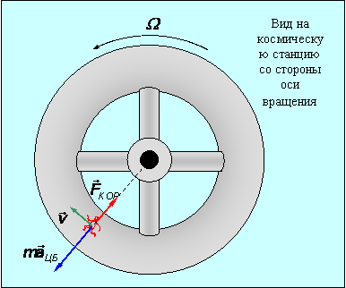 На рисунке изображена космическая станция будущего и её обитатель. Роль силы тяжести должна играть центробежная сила инерции. Частота вращения станции вокруг оси, проходящей через её центр равна 0.44 Гц, радиус станции 50 м. Чему равен вес обитателя массой 80 кг, если он бежит по станции так, как указано нарисунке?