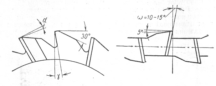 • Дисковые двух- и трехсторонние фрезы имеют главные режущие кромки на поверхности цилиндра и вспомогательные - на одном или обоих торцах. Для получения положительных передних углов на торцовых режущих кромках зубья выполняют с углом наклона ω= 10…15°. У трехсторонних фрез зубья делают разнонаправленными.