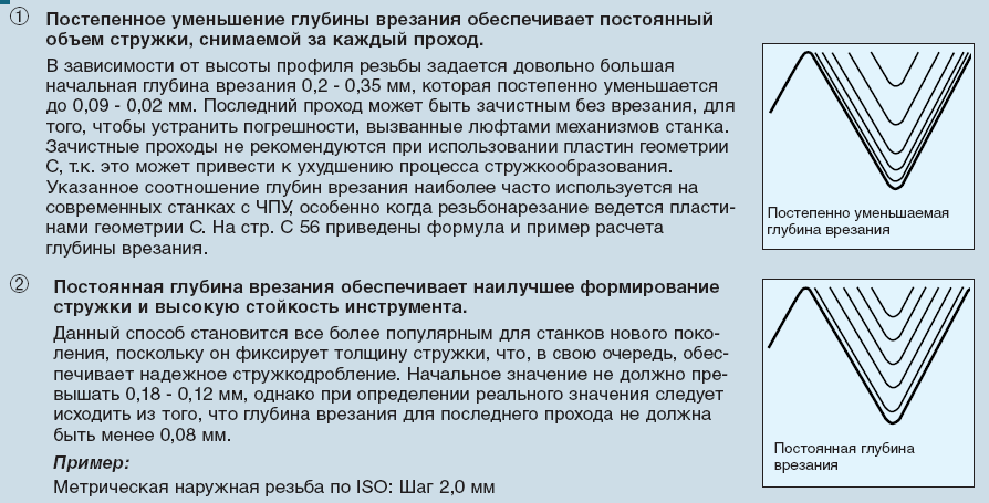 Начальное значение глубины врезания не должно превышать 0,12…0,18 мм, а на последнем проходе не должна быть менее 0,08 мм.