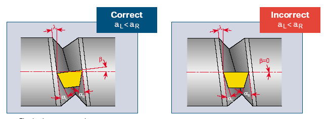 При установке резца без разворота значения статических задних углов с правой и левой стороны профиля можно выравнять, если произвеести заточку разных по величине инструментальных задних углов (рис.13 б).