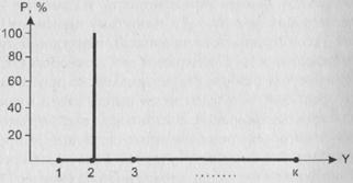 1) H (Y) ³ 0. Равенство достигается тогда, когда Y принимает только одно значение. Это – ситуация максимальной определенности: случайным образом выбрав объект, мы точно можем сказать, что для него рассматриваемый признак принимает упомянутое значение. Распределение Y выглядит следующим образом: