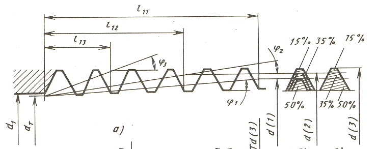 Черновой метчик выполняет основную работу по вырезанию профиля резьбы (50…70%) и имеет минимальный угол φ, а чистовой зачищает резьбу и калибрует (20…30%). Нагрузка может распределяться как по профильной (рис. 25 б) так и по последовательной (рис. 25 в) схемам резания.