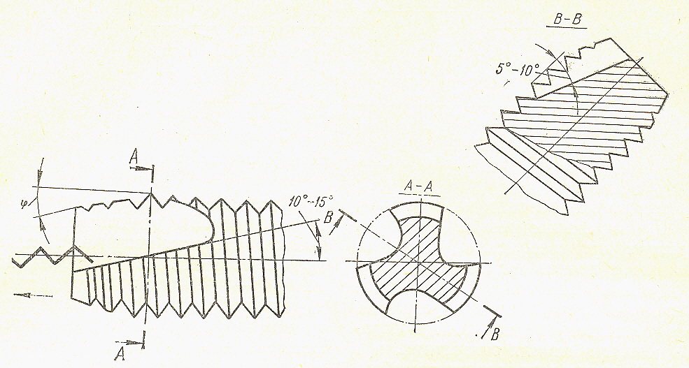 Стружечная канавка не сквозная, а прорезается на длине несколько превышающей длину режущей части под углом наклона к оси 100…150. Направление канавки противоположно направлению нарезки резьбы. Дно канавки располагается под углом к оси метчика 50…100. на калибрующей части выполняется обратная конусность не менее 0,2 мм на 100 мм длины.