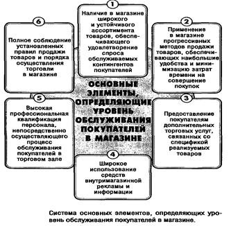 Хотя понятие "уровень обслуживания покупателей в магазине" носит обобщенный характер, оно определяется рядом конкретных элементов, которые играют различную роль в обеспечении этого уровня. К числу наиболее важных относятся следующие элементы (рис).