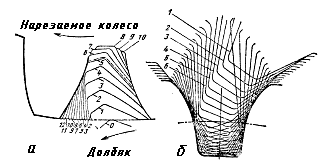 Из схемы формообразования впадины колеса (рис. 18.5. а), на которой показан ряд последовательных положений (обозначены цифрами 0, 1, 2, 3 и т.д.) режущих кромок долбяка, следует, что толщина срезаемого слоя при зубодолблении является величиной переменной не только при каждом последующем ходе долбяка, но и в течение срезания одного слоя. Наибольшую толщину срезаемого слоя снимают режущие кромки, расположенные по вершинам зубьев, а наименьшую – боковые выходные режущие кромки. С увеличением модуля нарезаемого колеса возрастает число рабочих ходов долбяка, необходимых для образования одной впадины, но средняя толщина срезаемого слоя при этом остается практически постоянной, так как изменяется только пропорционально скорости движения обката.