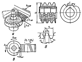 При нарезании прямозубых и косозубых колес червячными модульными фрезами имитируется зацепление обрабатываемого колеса с червяком, роль которого выполняет червячная фреза. За главное движение резания принимают вращение (рис. 18.7, а) фрезы, частоту п ф которого для создания движения обката согласуют с вращением заготовки так, чтобы за время одного оборота фрезы заготовка повернулась на k/z з – часть оборота, где k – число заходов червячной фрезы. Для радиального врезания фрезы в заготовку и нарезания зубьев по всей ее высоте фрезе соответственно сообщают радиальное движение подачи Ds рад и вертикальное движение подачи Ds в, направленное вдоль оси нарезаемого колеса. Перед обработкой червячную фрезу разворачивают так, чтобы направление ее винтовой линии совпадало с направлением нарезаемых зубьев. Заготовке косозубого колеса дифференциал, установленный в цепи обката станка, сообщает дополнительное вращение ± Ds, обеспечивающее при сложении с Ds в формообразование винтовых зубьев колеса. Знак дополнительного поворота Δ Ds зависит от совпадения или несовпадения направления винтовой линии зуба колеса с направлением вращения заготовки (рис. 18.7, в).