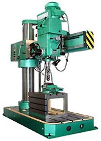 · 3. Радиально-сверлильные. Предназначены для многоинструментальной обработки отверстий в заготовках крупных деталей при единичном и серийном производстве. В отличие от вертикально-сверлильных врадиально-сверлильных станках совмещение оси отверстия заготовки с осью шпинделя достигается перемещением шпинделя (в полярных координатах) относительно неподвижной заготовки. Компоновка радиально сверлильного позволяет установить шпиндель с инструментом в любой точке рабочей зоны радиального станка за счет перемещения шпиндельной головки (бабки) по направляющим траверсы (рукава) и поворота траверсы вокруг колонны.